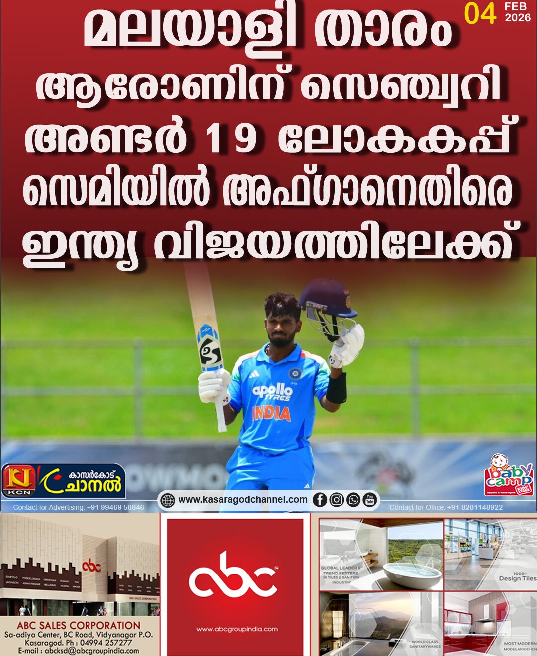 മലയാളി താരം ആരോണിന് സെഞ്ച്വറി; അണ്ടര് 19 ലോകകപ്പ് സെമിയില് അഫ്ഗാനെതിരെ ഇന്ത്യ വിജയത്തിലേക്ക്