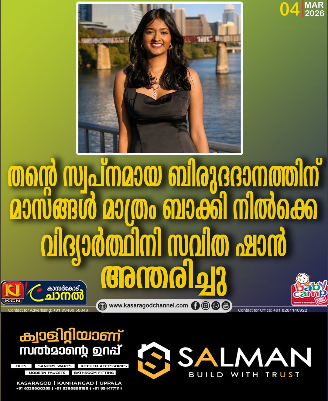 തന്റെ, സ്വപ്നമായ, ബിരുദദാനത്തിന് മാസങ്ങള് മാത്രം ബാക്കി നില്ക്കെ വിദ്യാര്ത്ഥിനി സവിത ഷാന് അ,ന്തരിച്ചു…